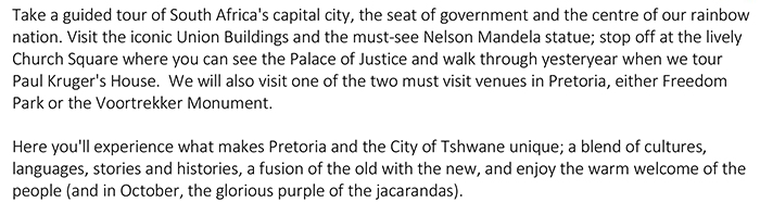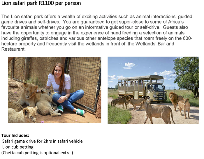 Pre and Post Conference ToursPlease vissit our website for a wide range of pre and post conference tours https://www.ubuhletours.com/index.php .5e |